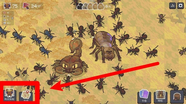 1.点击右下方的卡组按钮,即可进入技能卡界面,通过配置战斗技能来提升蚂蚁的战力,从而应对难度更高的敌虫挑战。