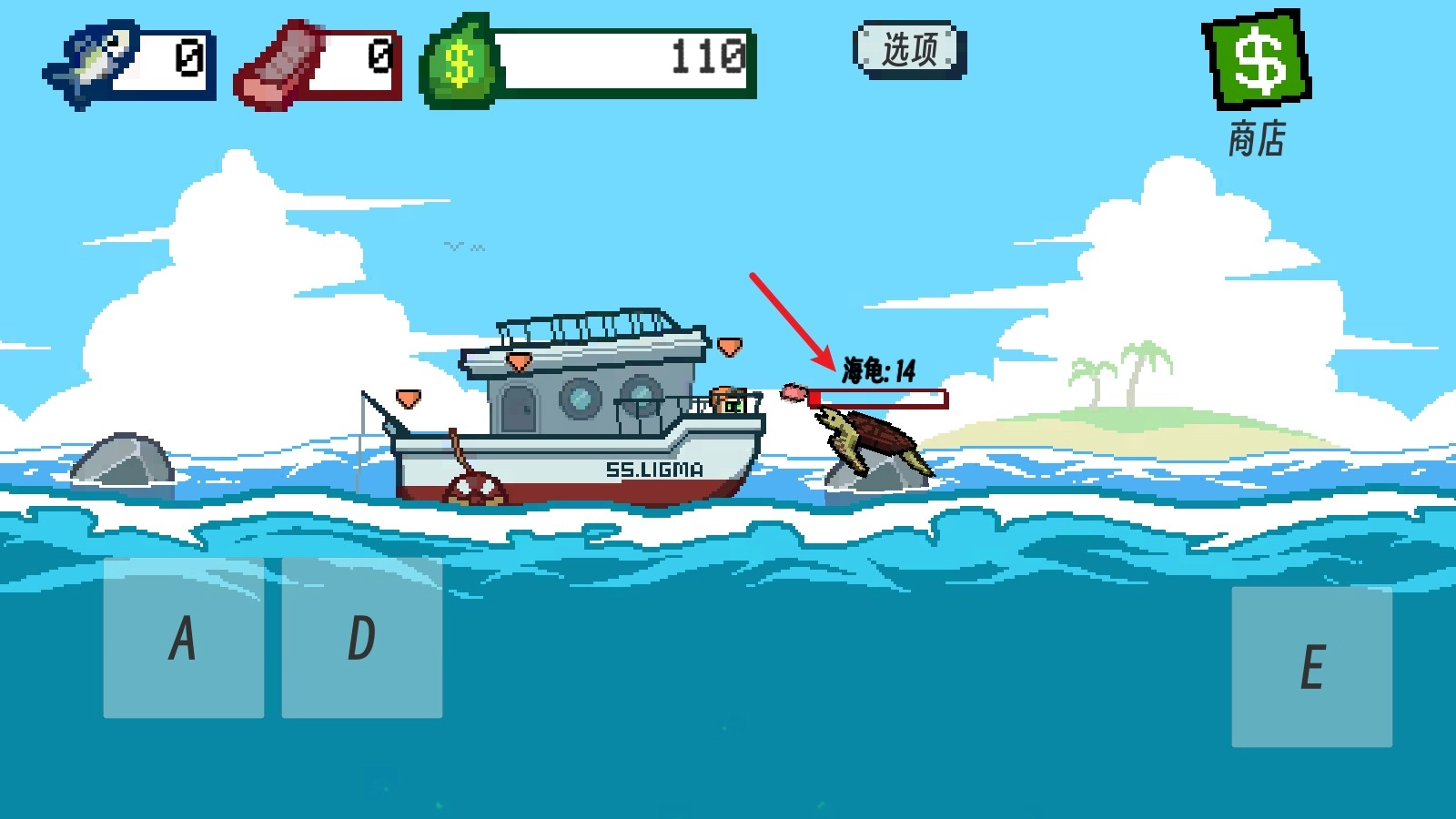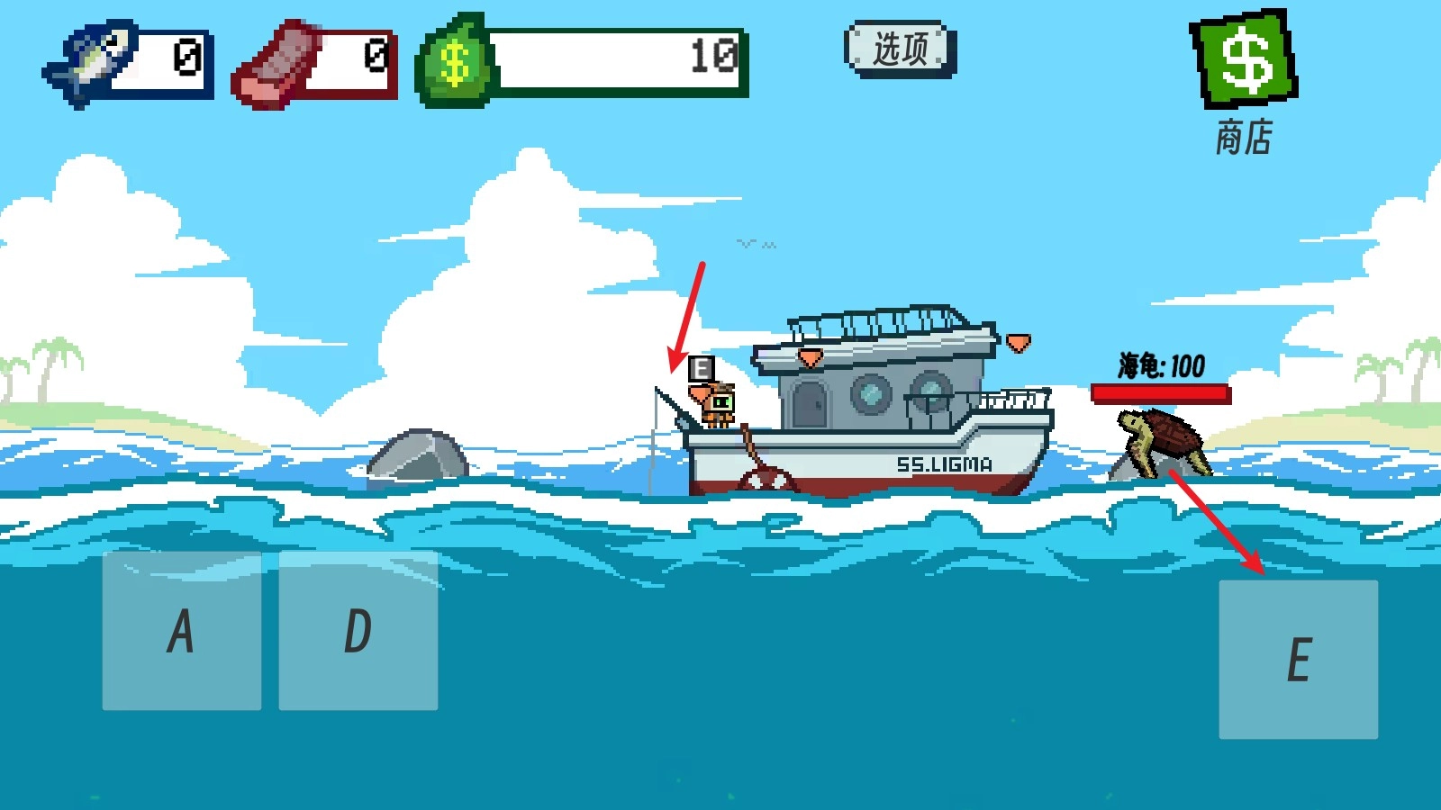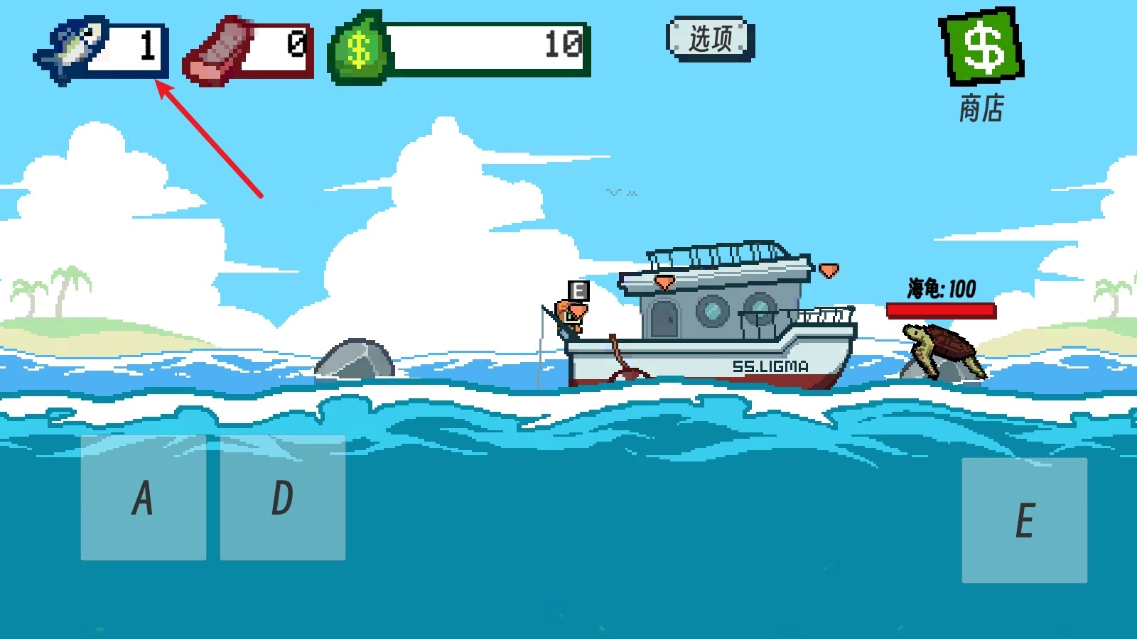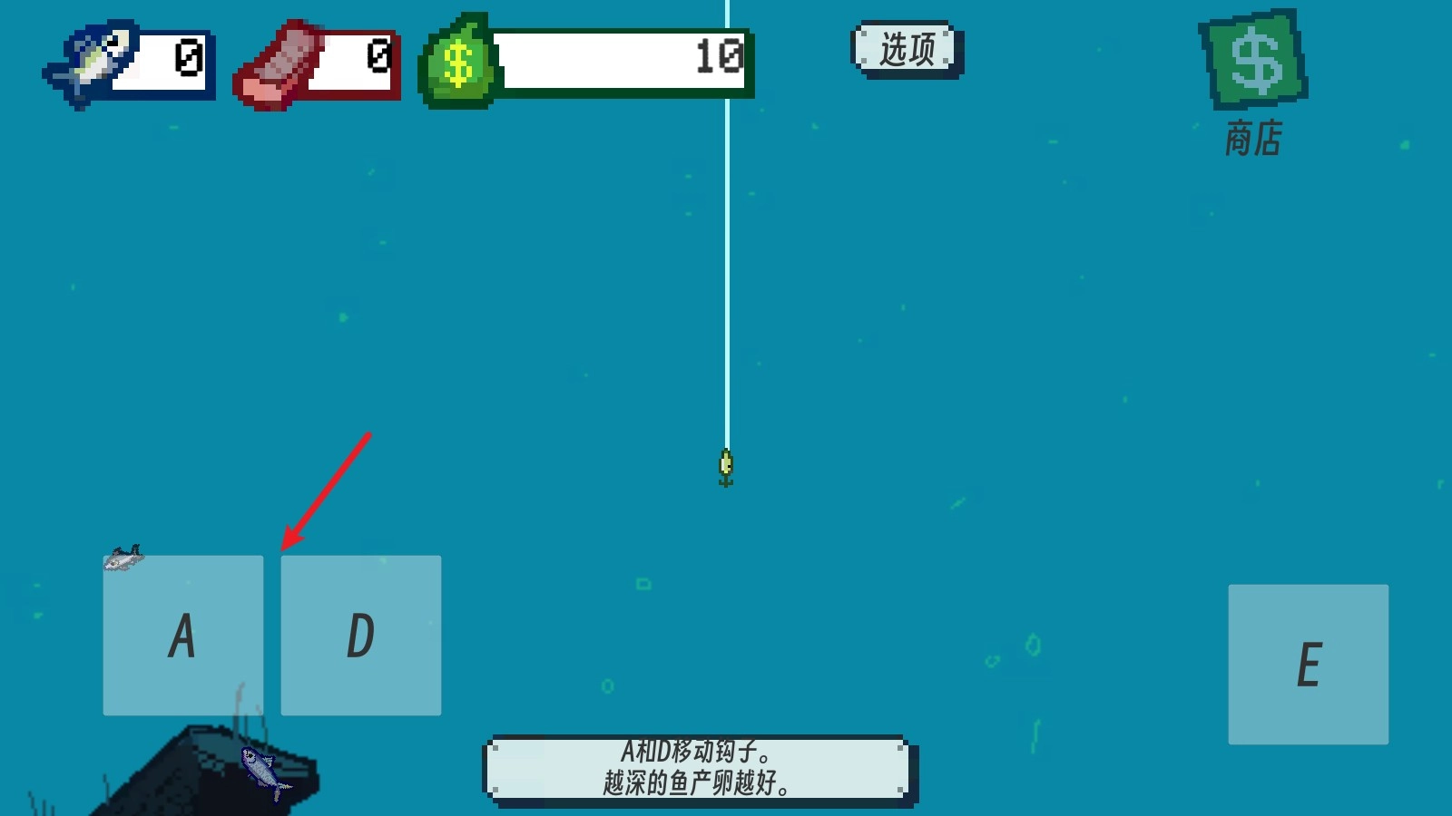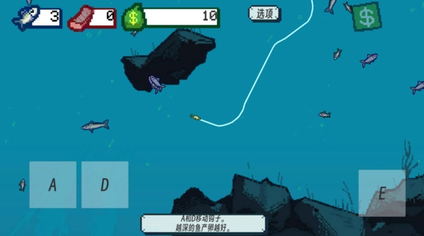 2、我们可以用A键和D键来操控鱼钩进行钓鱼,鱼钩下得越深,钓到的鱼品质就越高。