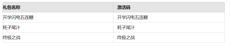 这份开学季限定礼包会在限时活动期间放送,领取方式也十分便捷——只要在指定位置输入对应的激活码就能轻松获得。下面是激活码清单,赶紧来领取属于你的开学季专属福利吧!