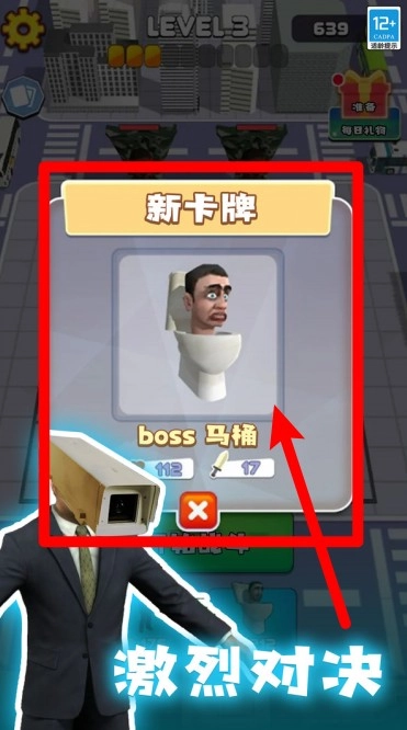 2.战胜敌人后能够解锁新的卡牌,获取boss马桶角色卡,以此来强化当前队伍的战斗配置。