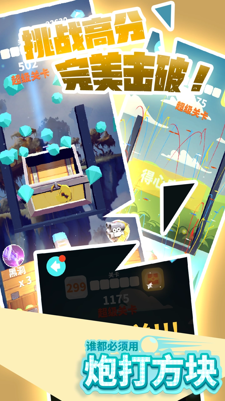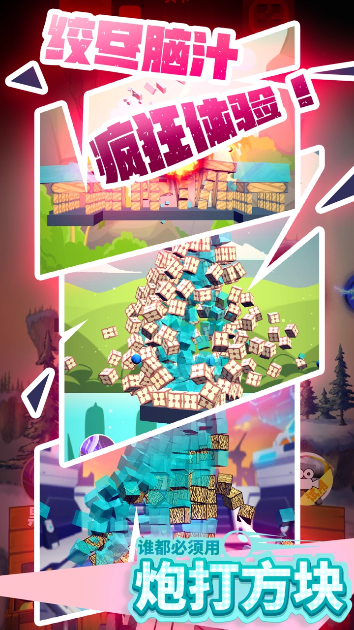 玩家操控大炮,以最少的发射次数清除所有方块,快开动你聪明的小脑袋吧。
