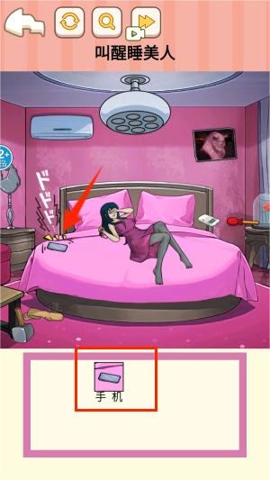 3、图片里的女孩子睡着了,你得找出房间内能够用来叫醒她的工具,像闹铃之类的都可以。