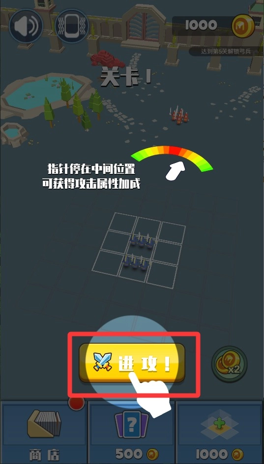 1、先点击进攻按钮派兵出击,新手关卡的敌人实力不强,让小兵们往前冲锋就可以了,要注意别让弓箭手跑到最前面。