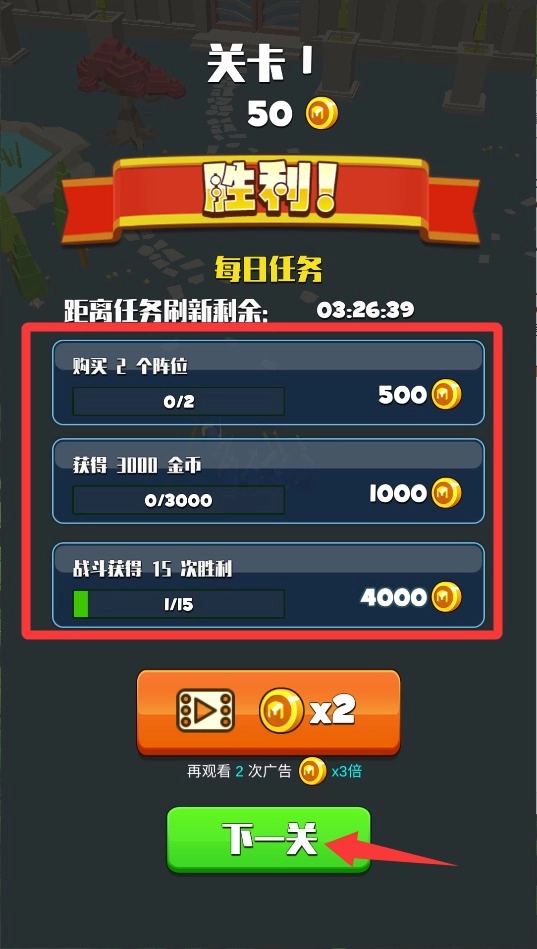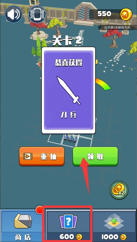 3、战斗胜利后点击奖励箱,就能领取新的武器和装备;换上更好的弓箭能射得更远,升级后的盾牌则更能抵御攻击。