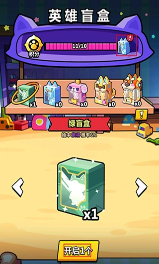 2、击败BOSS后可获取英雄盲盒,开启盲盒有机会获得英雄;盲盒共分五个等级,等级越高,开出英雄的概率越大;开启盲盒还能积累积分,从而获得额外的盲盒奖励。