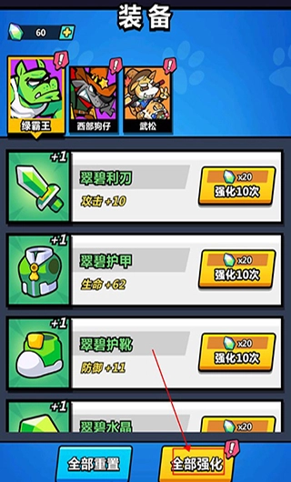 6、每位英雄都拥有专属的装备,玩家能够通过一键强化升级的功能来提升它们的战力。