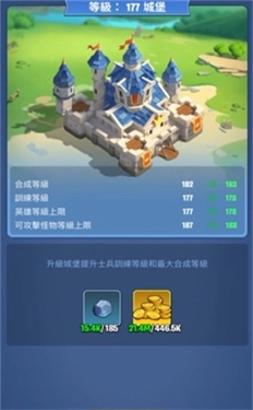 2、点击进入后,消耗金币与石块能够升级自身的城堡,更优质的城堡可以解锁更强大的英雄和防御塔。
