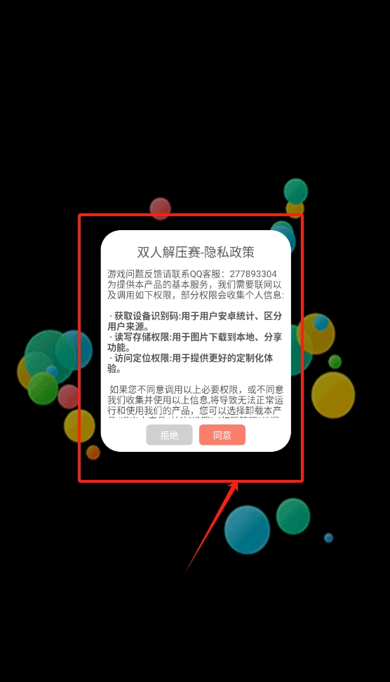 1、此页面为隐私政策页面,顶部显示名称及客服QQ。页面下方列举了获取设备信息、存储权限、定位权限的具体用途,点击红色文字“同意”即可继续使用,若点击灰色的“拒绝”按钮,则可进行卸载操作。