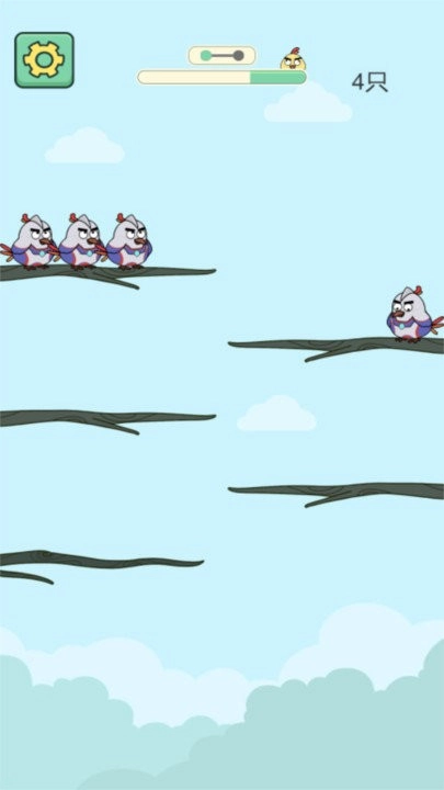 1、核心玩法要求观察树枝的布局,通过拖拽操作把相同颜色的小鸟移动到同一根树枝上,当凑齐四只同色小鸟时即可完成组队消除。
