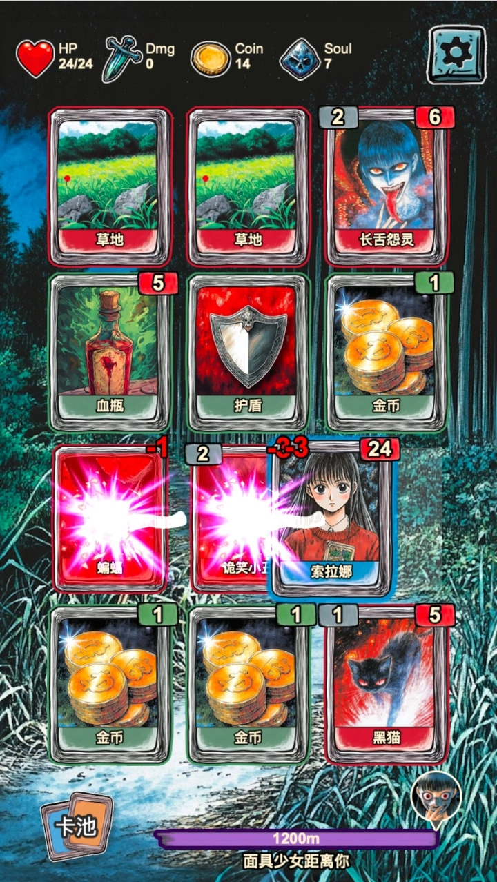 1.初始状态下玩家仅有20点血量,遇上高攻击力的怪物,一次攻击就可能损失四到五点血量,因此每移动一步都得仔细计算上下左右卡牌带来的数值变动。