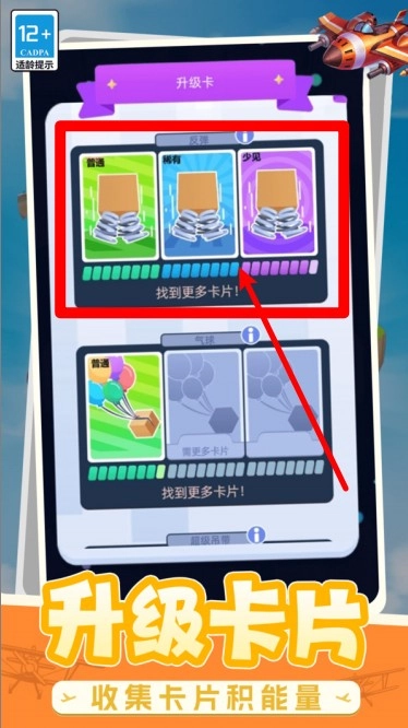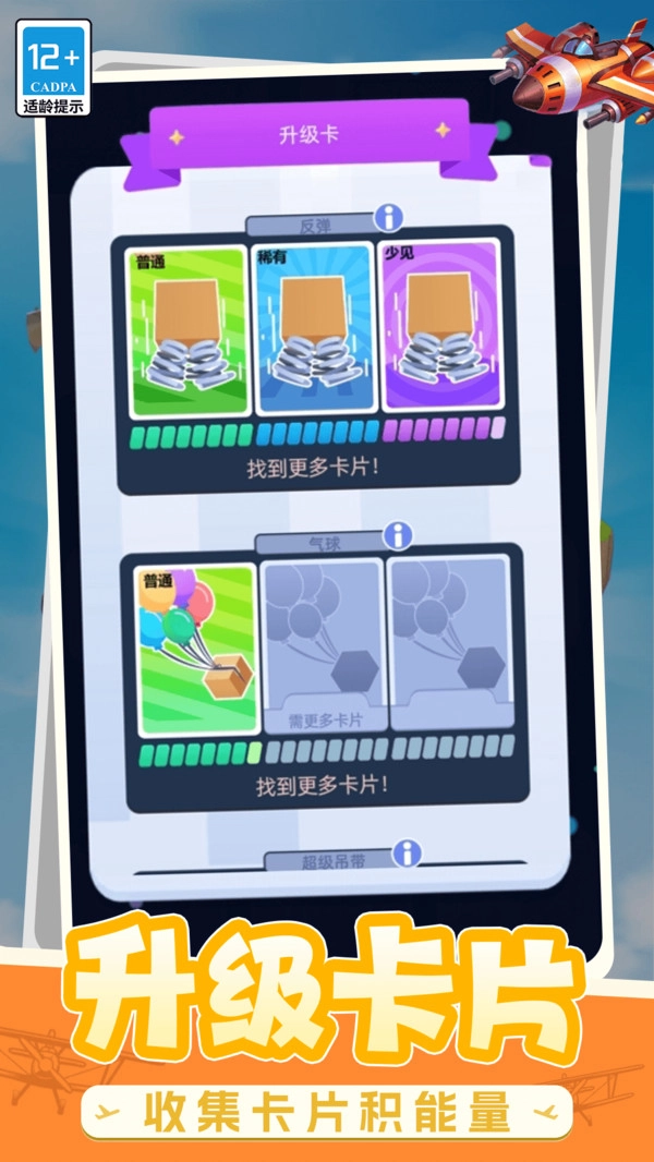 3.卡片能量升级:当收集到足够数量的同类型卡片时,即可解锁升级功能。完成升级后,能够显著提升飞机的各项属性以及飞行能力。