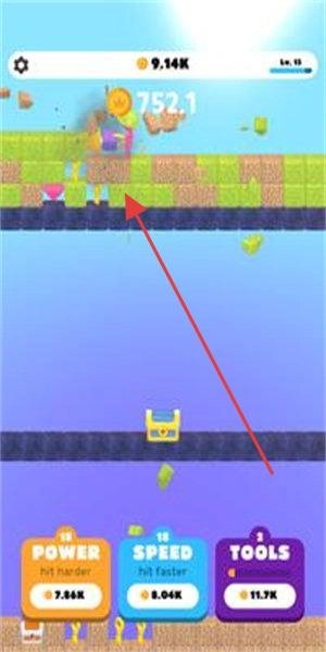 1、控制角色挖掘方块时,优先选择绿色区域(例如箭头所指的位置)进行挖掘,通过这种方式积累金币,积累的金币可以用来升级【POWER】等属性,从而提升角色的挖掘能力。