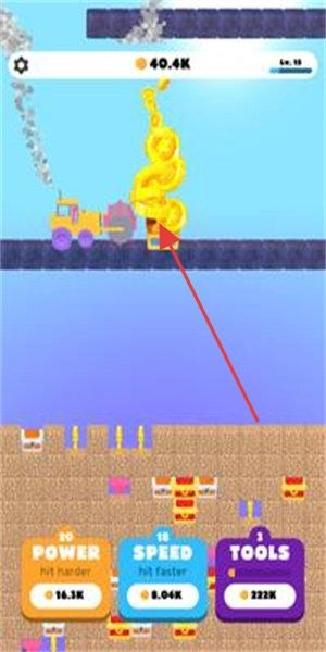 2、碰到金色螺旋币堆(像工程车附近那种),就集中力量挖掘,尽快收集大量金币,用来升级,提高挖掘效率。