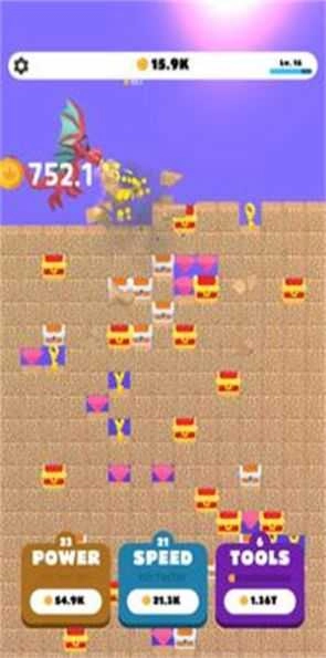 3、在沙地区域,对准彩色方块(箭头所指位置)进行挖掘,即可解锁宝箱和奖励;借助龙的助力,还能进一步扩大挖掘范围。