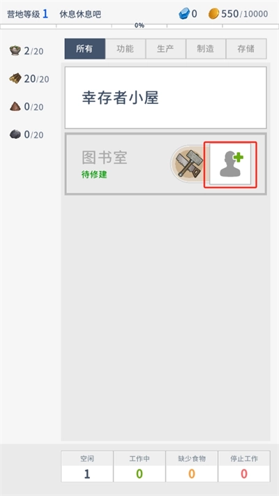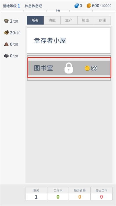 3、进入后会看到需要在营地建造更多建筑,一开始我们只能建造图书室。