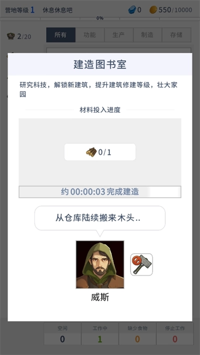 5、在这里找到空闲人员后,系统会自动进行建筑修建,请注意建筑修建需要材料,你要确保材料充足。