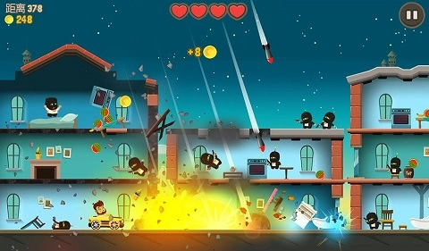 大家可以体验到单手操控就能感受猛烈撞击的快感,贴心的新手教程简单易懂,只需上下滑动屏幕,就能操控这位大胡子上下跳跃、穿梭撞击在各楼层之间,在躲避敌人攻击的同时攻击敌方、解救人类。