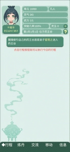 《药王谷女修修炼手札》是一款文字模拟修仙游戏,带你进入神秘的药王谷,成为一名女弟子,开启一段独特的修行之旅。你将从基础功法学起,逐步提升炼丹技艺,与同门伙伴共同成长。游戏着重打造丰富的人物关系,你可以通过赠送礼物、组队历练等方式增进与师兄妹的好感,甚至发展出浪漫情缘。高度自由的角色养成系统允许你自由选择修炼方向,通过收集材料炼制稀有丹药、探索未知洞府,体验真实的修仙日常。丰富的剧情分支与随机事件提升了游戏的趣味性,构建出一个引人入胜的奇幻世界,期待你的亲身体验。