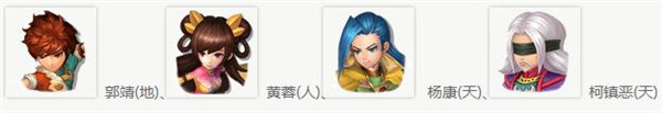 郭靖(地)、 黄蓉(人)、 杨康(天)、 柯镇恶(天)