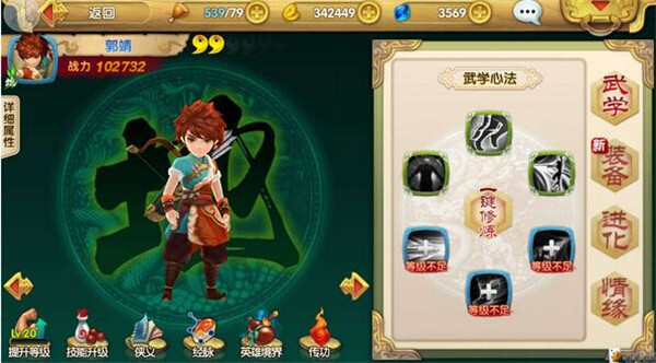 郭靖:之前提到过,和上个阵容不一样的地方在于,情缘关系只有与黄蓉的“天生一对”以及与岳飞的“侠之大者”这两种。
