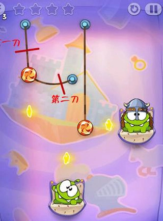 第四关:先竖直切开左边的糖果,吃到星星后就切断最左侧的线。右边的绳子操作方式相同。