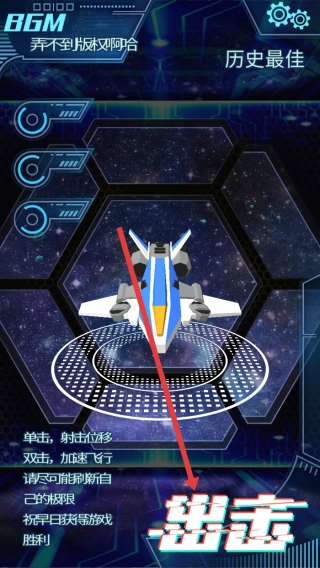 1、进入战机界面后,点击【出击】按钮,驾驶蓝白战机驶入太空赛道,练习并熟悉射击(单击操作)与加速(双击操作)这两种基础操作。