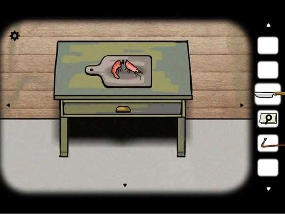 7、用自己做的钓具顺利钓起一只虾,把它放在砧板上,再用刀切成两半,这样就得到了一把钥匙。