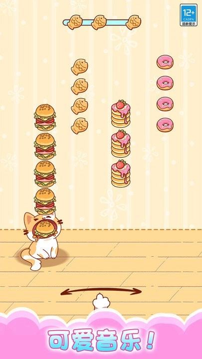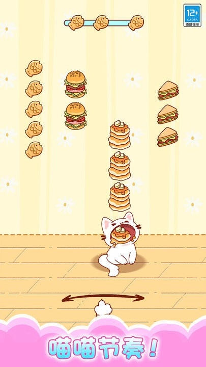 1、音乐节奏闯关玩法:跟随背景音乐的节奏滑动屏幕,操控小猫移动到恰当位置,接住掉落下来的食物。