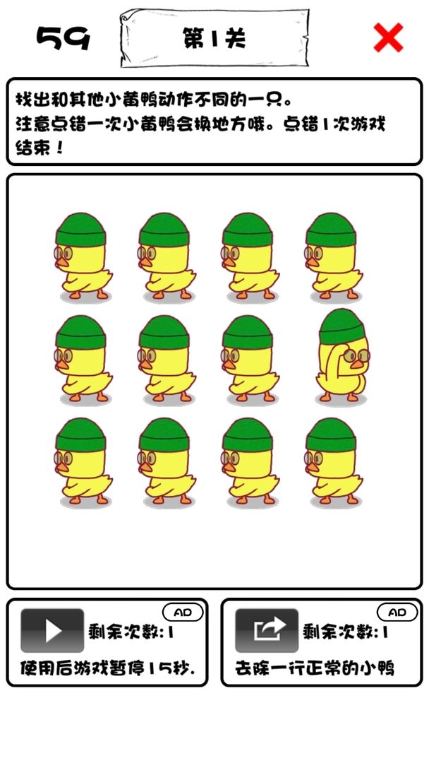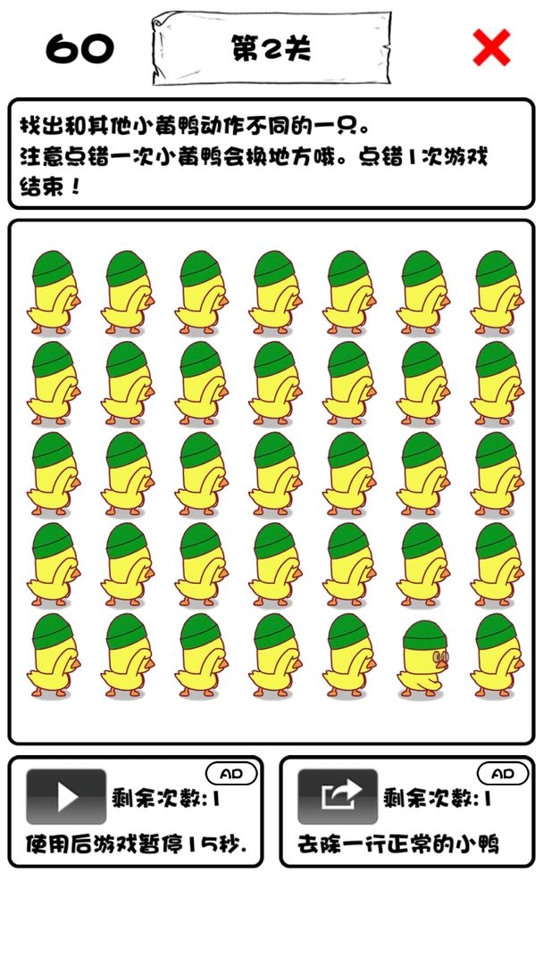 《一起来找小黄鸭》是一款全新的休闲益智游戏。在游戏里,玩家需要从众多小鸭中找出那只与众不同的,才能顺利通关。游戏有着可爱的画风、丰富的关卡,以及富有挑战性的关卡设计,相信能为你带来前所未有的益智游戏体验,快来试试《一起来找小黄鸭》吧!