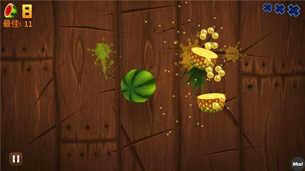 Classic:在图标是西瓜的Classic模式里,水果和炸弹会持续出现,游戏时间没有限制。水果方面,你有三次没切到的失误机会,而一旦切到炸弹,游戏就会立刻结束。每攒够100分,系统就会自动补回一次之前失去的机会。