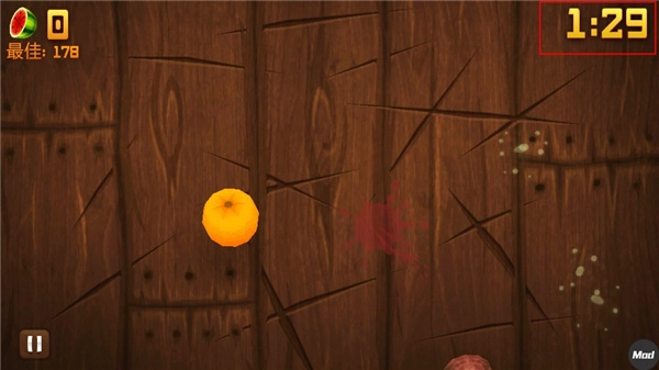 这个模式也叫时间模式或禅模式,时长为一分半钟(即90秒)。该模式里没有炸弹,水果会持续不断地出现,玩家完全依靠自身技巧来切割尽可能多的水果块。此外,屏幕左右两侧还有一定概率弹出难以切割的特殊水果。