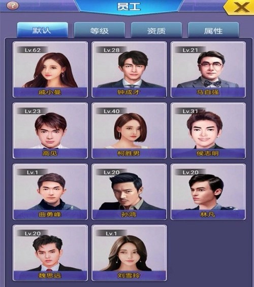 目前游戏里的员工不需要手动招揽,每当你完成一定数量的主线任务、提升自身地位时,系统会自动解锁新员工。比如首充赠送的孙鸿、VIP3解锁的丁奇、VIP5解锁的陈星耀、VIP7解锁的杨亨。这里特别推荐一下任意金额充值就能获得的孙鸿——这位帅哥不仅颜值在线,公关值也相当出色,是升级过程中的得力助手。获得员工后,需要用经验值为他们升级,因此游戏里的钱和经验值永远都不嫌多。员工的属性会直接加成到玩家身上,称他们为你的“分身”也不为过。需要注意的是,提升员工属性是提高自身实力值最关键的方式。