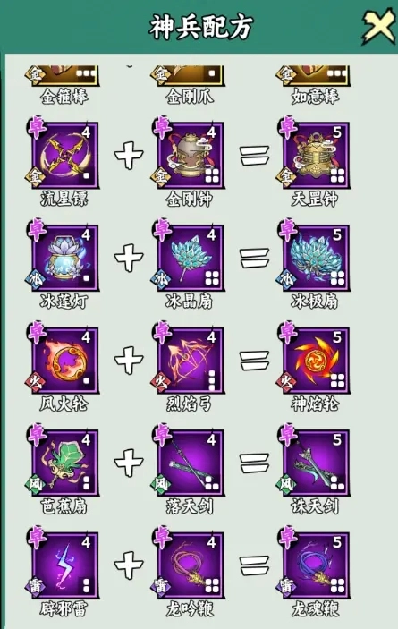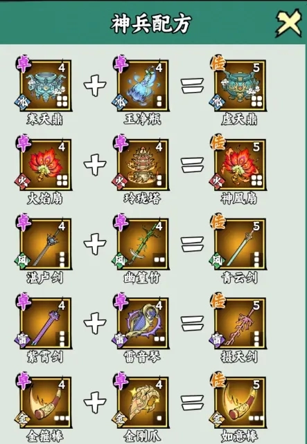 4、要是你对神兵合成一窍不通,也不了解具体需要哪些法宝,不妨看看这份详尽的神兵配方图鉴。它会为你提供清晰的指南,你可以根据图鉴里列出的各类法宝及对应的合成配方,合成出自己渴望已久的神兵。