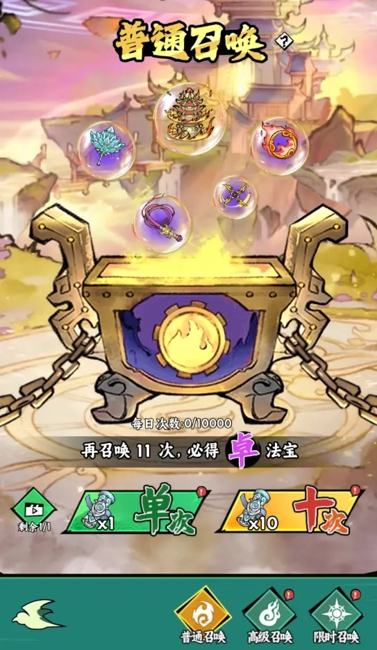 2、我们能够通过召唤的方式获取所需的法宝,需要注意的是,召唤分为普通召唤、高级召唤和限时召唤这几种类型,而法宝召唤卷可以通过日常任务、坊市商店购买、等级提升奖励、修行奖励以及关卡波次宝箱这些途径来获得。