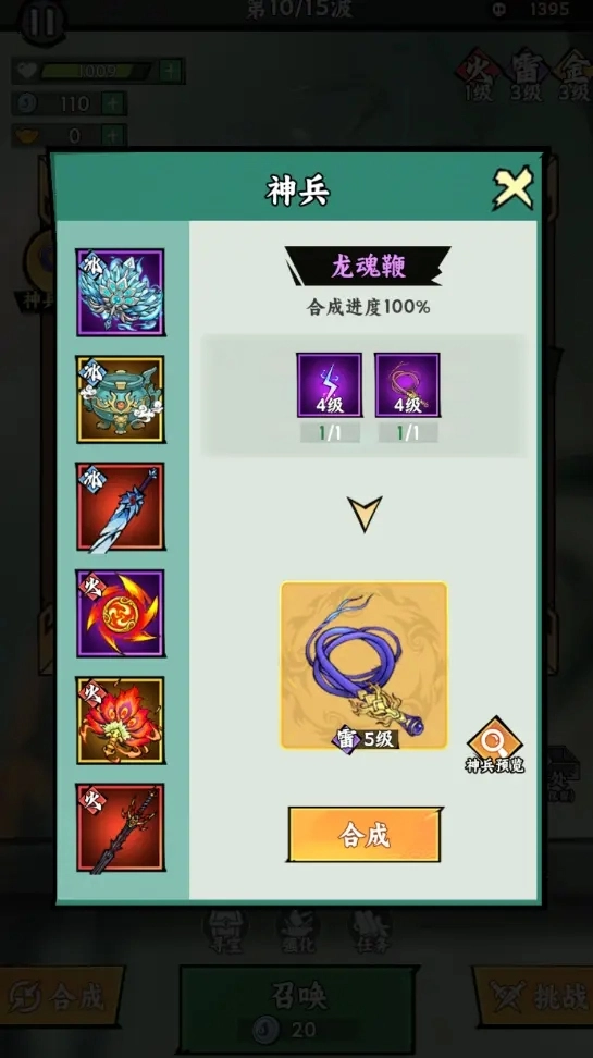 6、要在内合成神器,得先把神器配方里的法宝合成到4级,这时候旁边左上角就会出现一个神兵合成的UI提示。