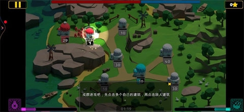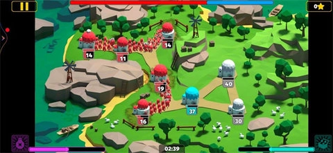 开始时你会拥有一座或多座屯有兵力的堡垒,目标是占领那些未被开拓的堡垒,逐步囤积士兵,凭借谋略与智慧消灭其他敌方士兵,赢得战局胜利。首先点击我方的红色堡垒(标识为红色),再点击未被占领的白色堡垒,就能指挥士兵展开攻陷行动;争夺成功后,该堡垒会变为红色。等兵力积累到合适数量,就可以进行下一步的讨伐攻占。当敌方的所有兵力和城堡都被我方攻陷时,战斗便宣告胜利。