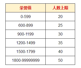军团的强大离不开每位成员的付出,军团的人数与荣誉值相关联,其最多可招募50人。