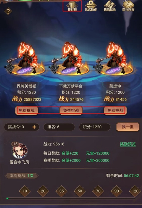 6、当玩家培养出战力足够高的队伍后,就能够参与排行挑战了,与其他玩家展开对战,赢取积分,进而参与比武排名。