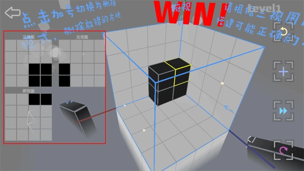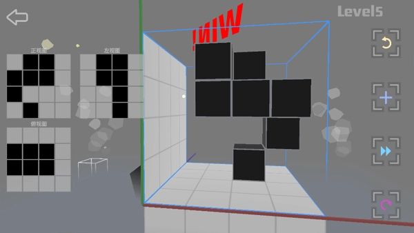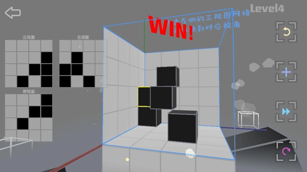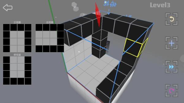 第一关的规则是:根据左视图、俯视图和正视图这三个不同视角的图样,来对应放置方块。