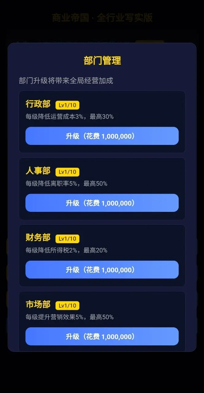 《商业帝国》是一款从零起步打造商业版图的模拟经营游戏。从街角的小店铺到跨国企业集团,你的每一次决策都关系到财富的积累。市场环境会随时间动态演变,你得敏锐洞察商机,直面竞争对手的挑战,合理把控资金链,才能一步步将商业梦想照进现实。