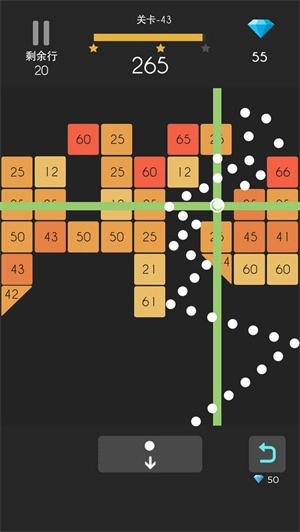 2、当所有圆球都回到地面后,上方的全部方块会向下移动一格。玩家需要在发射圆球时选择合适的瞄准路线,同时计算好反弹路径,尽可能让圆球在方块之间进行更多次的反弹,以便在方块移动到地面之前,快速消除屏幕上出现的方块。
