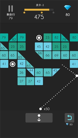 1、游戏里,玩家要把屏幕下方的圆球,顺着瞄准线发射到屏幕中间那些带有不同数字的方块上,让圆球在多个方块和墙壁之间持续反弹,直到它碰到地面。圆球每和方块碰撞一次,方块上的数字就会减一,等数字变成零,这个方块就会消失。