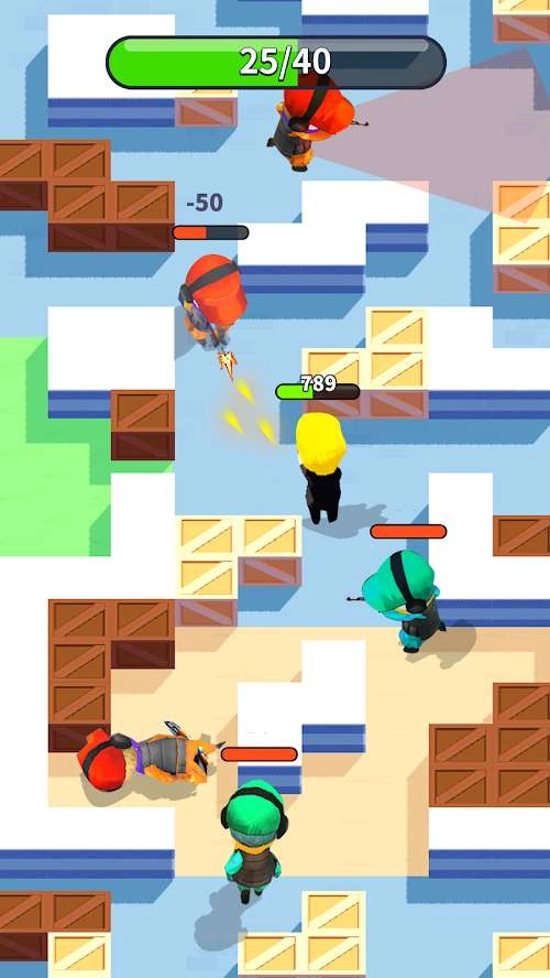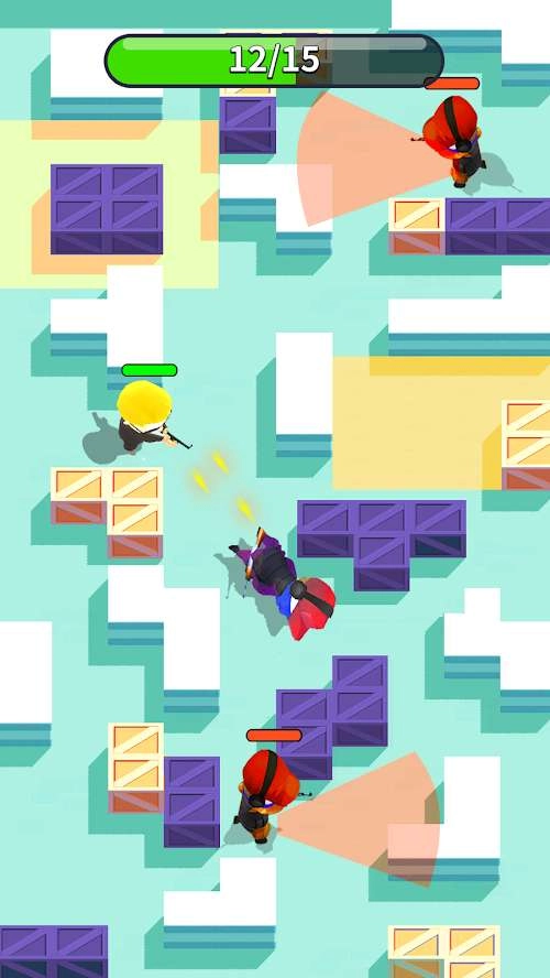 这款游戏的配色十分清新,每一关的任务难度各有不同,玩家需要消灭指定数量的敌人,然后安全抵达场景里的出口。成功通关后可以获得金币,用来购买辅助道具。随着通关数量的增加,还能解锁更多的人物角色。另外,别忘了可以利用周围的环境来打击敌人哦。