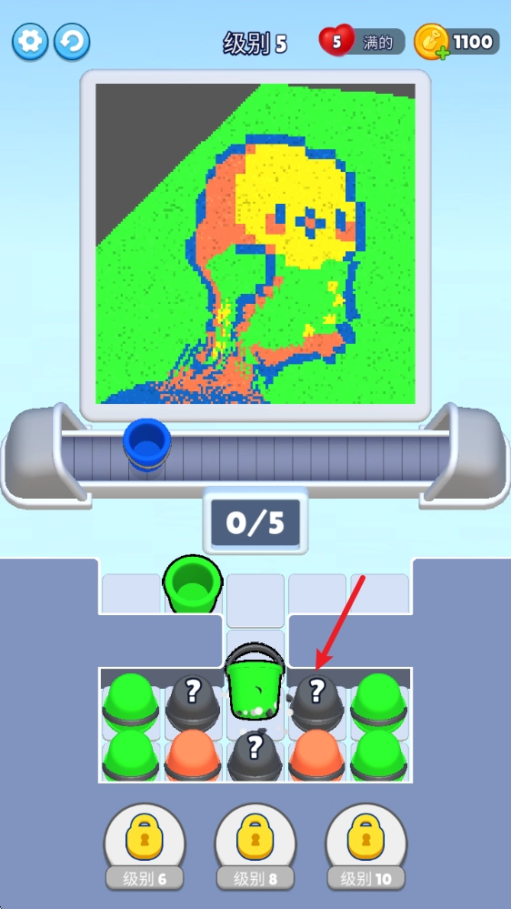 1、点击下方的桶,就能将其放置到传送带上,用来收集最底部的沙子。