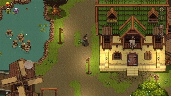 2、点击开始按钮后游戏将正式启动,启动后屏幕左侧用于控制角色移动,初始场景设定在城镇中。