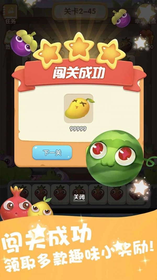 1、以最快速度消除所有水果,尽情开启脑洞欢乐互动,这场有趣的消除历险记,现在就一起出发吧!