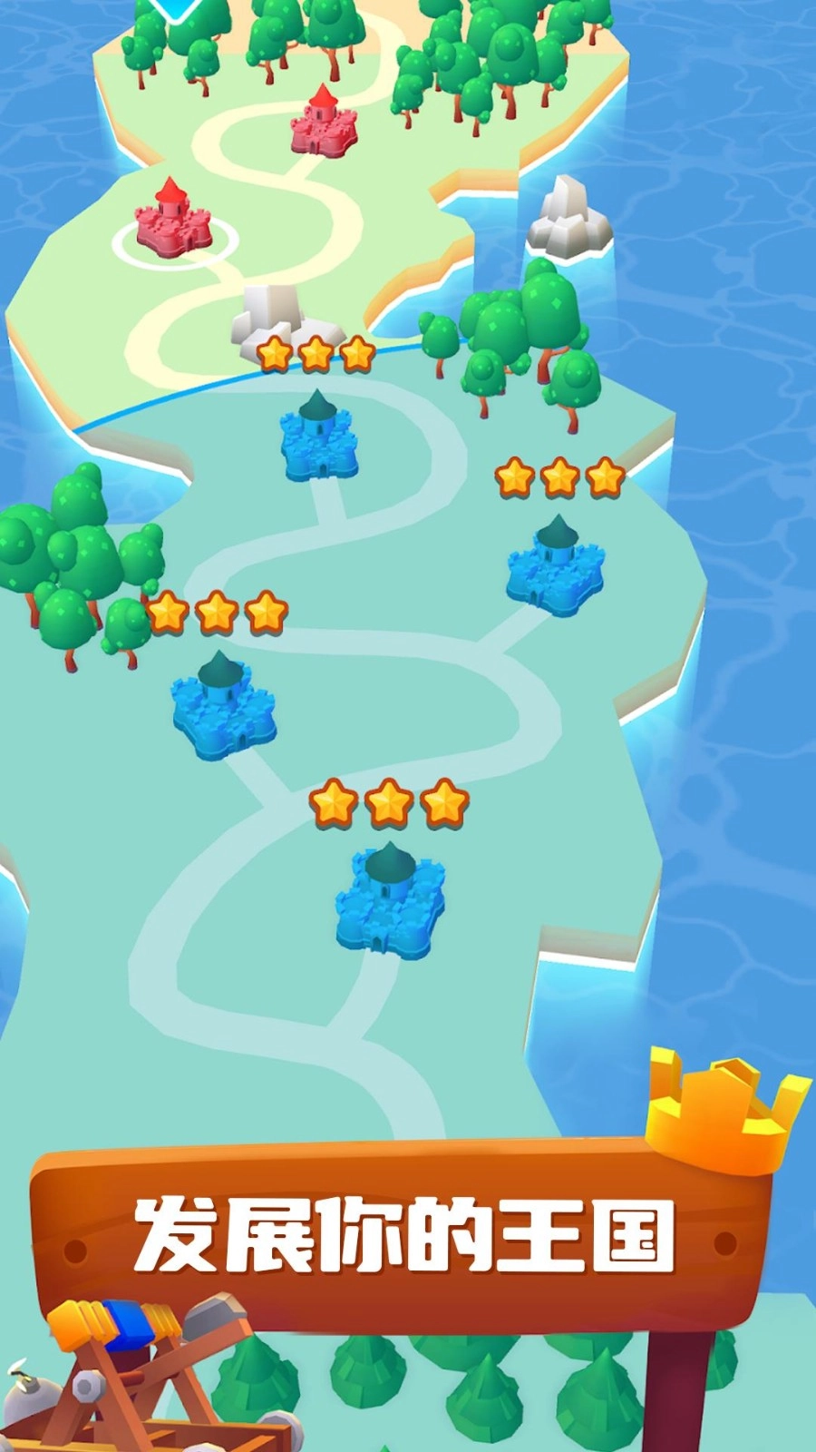 1.闯过每一个冒险关卡,每一关都是一场全新的城堡攻防战,只有胜利才能拓展更多领地。