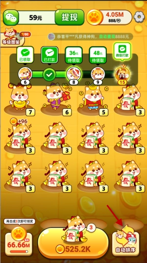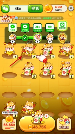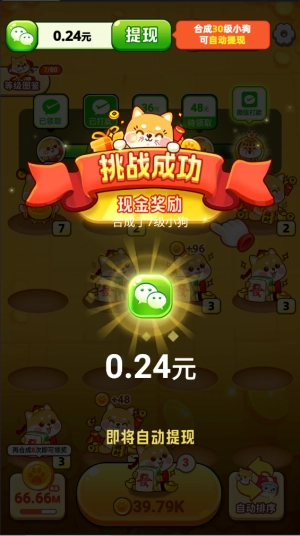 2、游戏内共有80种不同的小狗,每次合成新的小狗都能获得红包奖励,达成一定等级还能直接提现!