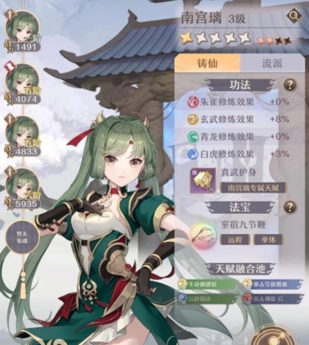 在角色属性方面,南宫璃拥有火系效果强化以及御剑效果提升20%的特质,无疑是火系御剑流派的理想之选。功法修炼时,对玄武与白虎功法有着不错的加成效果,能进一步增强自身的坦度。其专属天赋“真武护身”可依据生命值来提升暴击等级,与职业定位十分契合。而法宝“室宿九节鞭”则完美弥补了火系御剑缺乏突进技能的短板。
