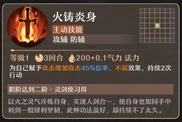 火铸炎身(主动技能):为自身施加攻击提升效果(提升幅度为攻击力的45%)与不屈效果,持续时间为2次行动。